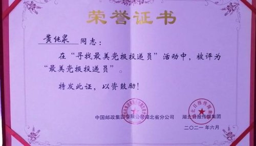 7月20日,荊州市郵政分公司相關負責人告訴記者,在中國共產黨百年華誕之際,黃純泉獲得湖北日報、湖北省郵政分公司聯合表彰的“最美黨報投遞員”稱號,屬荊州市唯一。記者立即聯系到了黃純泉。