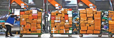 中國(guó)郵政集團(tuán)有限公司河南省鄭州郵區(qū)中心,工作人員在轉(zhuǎn)移快遞包裹。新華社記者 張浩然攝
