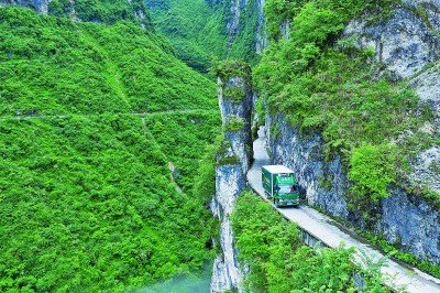 郵車行進(jìn)在大渡河大峽谷入口的懸崖絕壁之上。 新華社發(fā)