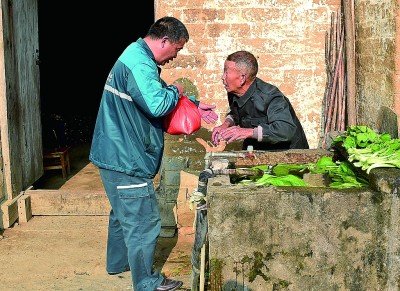 在安徽太湖縣北中鎮(zhèn)桐山村,郵遞員吳義陽(yáng)將代購(gòu)的糯米送到老人手中。 新華社發(fā)