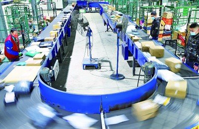 在中國(guó)郵政衡陽(yáng)郵區(qū)中心局郵件處理中心,工作人員在分揀快遞包裹。 新華社發(fā)