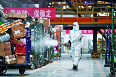 在中國(guó)郵政寧夏銀川郵區(qū)中心局郵件處理中心,工作人員在分揀車間進(jìn)行消殺作業(yè)。 新華社發(fā)