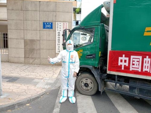 成都市郵政分公司相關負責人介紹,為了保證運輸生活物資能快速、新鮮、安全地到達管控區(qū)的居民手里,“郵遞小哥”每天穿著防護服至少14個小時,常常忙到深夜,第二天又奔赴在抗疫一線。