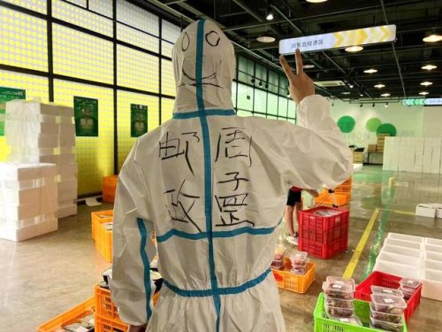 “當裝滿郵車的蔬菜進入社區(qū)時,我遠遠就看著龍彪,厚厚的防護服穿在身上只剩下兩只瞪得大大的眼睛。”他的同事唐浩心疼道,他一開就是幾小時,到了管控區(qū)常常連一個面館都找不到,就在車上隨便吃點又繼續(xù)下一站。