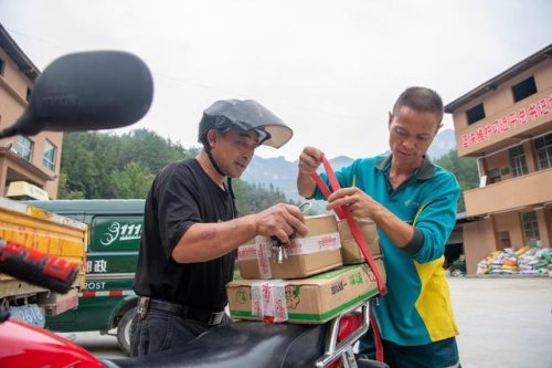 9月15日,在何家巖村村郵站,投遞員張永洪(右)幫助村民將收到的快遞物品綁上摩托車。