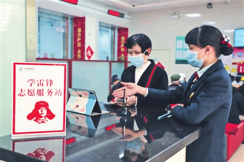為擦亮“學雷鋒”志愿服務品牌,貴港市70個郵政金融網點目前都設立了志愿服務站,自覺為客戶提供更加優質的服務,進一步提升服務滿意度。圖為該分公司和平路網點員工向客戶講解金融知識。