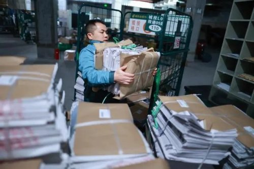 莫富元在貴州省龍里縣草原路郵政郵件處理中心分揀當(dāng)天的報(bào)紙(2月14日攝)。