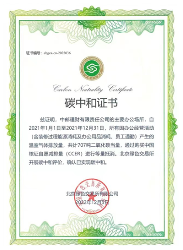 在以“眾生的地球”為主題的第54個世界地球日到來之際,北京綠色交易所為首批開業(yè)的銀行理財子公司“中郵理財”出具組織運營層面“碳中和”證書。由此,中郵理財成為國內(nèi)領(lǐng)先的獲得權(quán)威機構(gòu)認證的“碳中和理財公司”,為世界地球日增添一抹新的綠色。