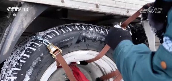 一大早,吉林臨江市鄉郵員王明杰在整理完今天要送的快遞包裹后,將小型面包車更換成自重更大的箱貨車,為車胎綁上防滑鏈。