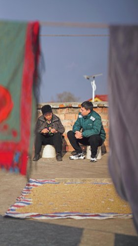 郵政小哥與彝族同胞交流。 □熊嘉欣 攝