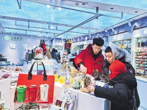 晚上10點(diǎn),游客在冰雪郵局選購文創(chuàng)產(chǎn)品。□白雪娟 攝