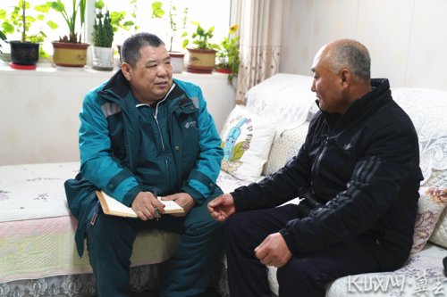 郭紅崗(左一)利用送快遞的間隙到村民家走訪調研,完善兩會建議。長城網·冀云客戶端記者 劉俐驗 攝