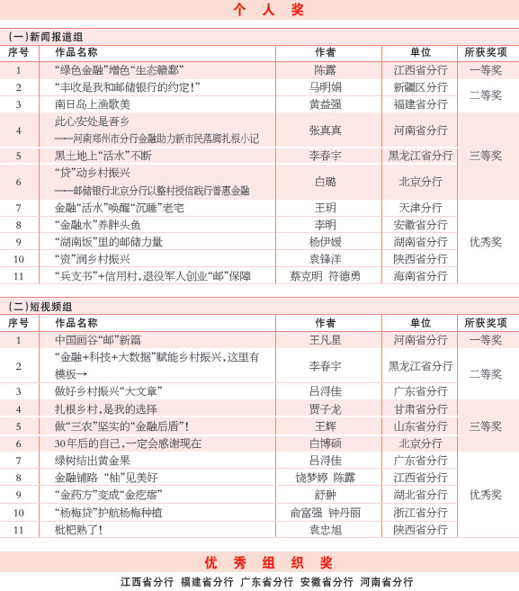 自活動啟動以來,郵儲銀行各級機構積極響應,廣大員工踴躍參與,共收到來稿1100余篇(含短視頻)。按照公平、公正、公開的原則,評審專家評選出入圍稿件,并結合線上展播投票情況,分別評選出“新聞報道組”“短視頻組”一等獎1名、二等獎2名、三等獎3名、優秀獎5名;根據各單位投稿、發稿和獲獎情況,評選出“優秀組織獎”5名(見下表)。