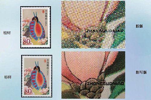 印刷版別是郵票真偽鑒別最本質最重要的鑒別特征,所以要識別假郵票就需要掌握不同版別的印刷特點。而且,郵票印刷廠的印制設備也是仿印假票的小作坊所無法比擬的,仿印的假票無法達到與真郵票在印刷制版上完全相同,通過印刷版別的比對可以辨別檢材的真偽。