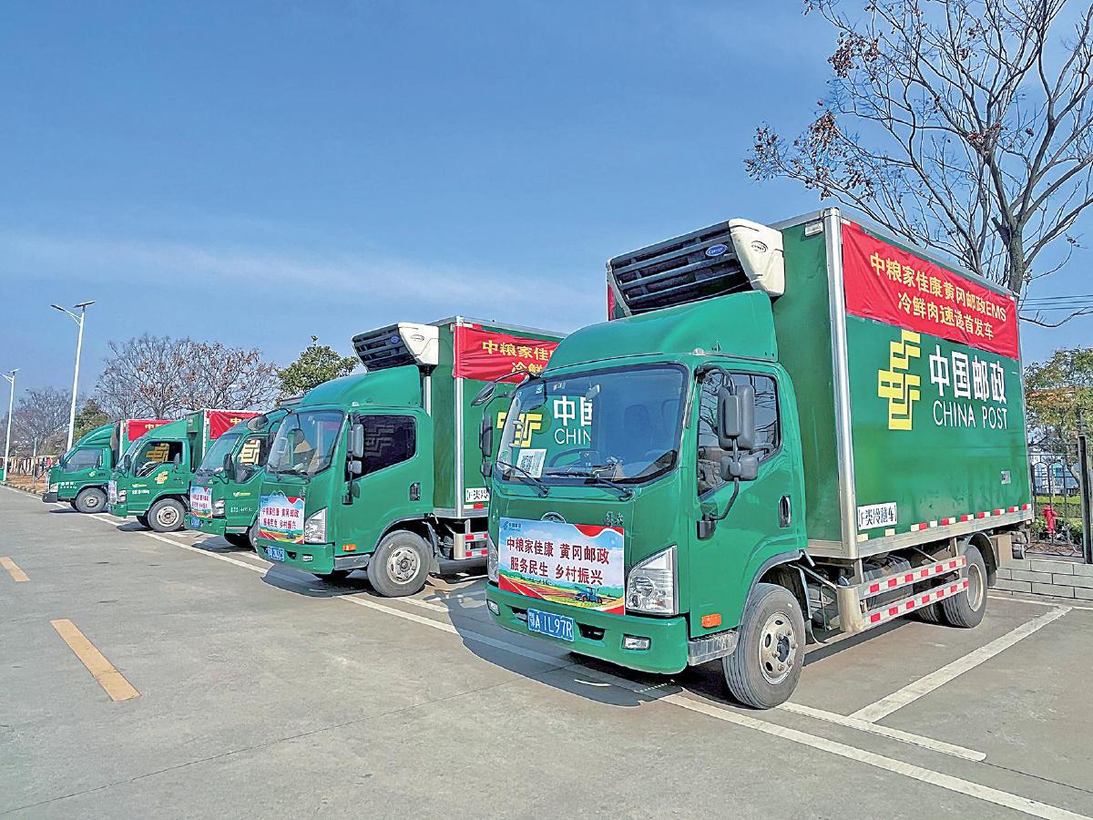 在黃岡市黃州區(qū)的中糧家佳康(湖北)有限公司園區(qū),帶有郵政標識的冷藏車依次排開。