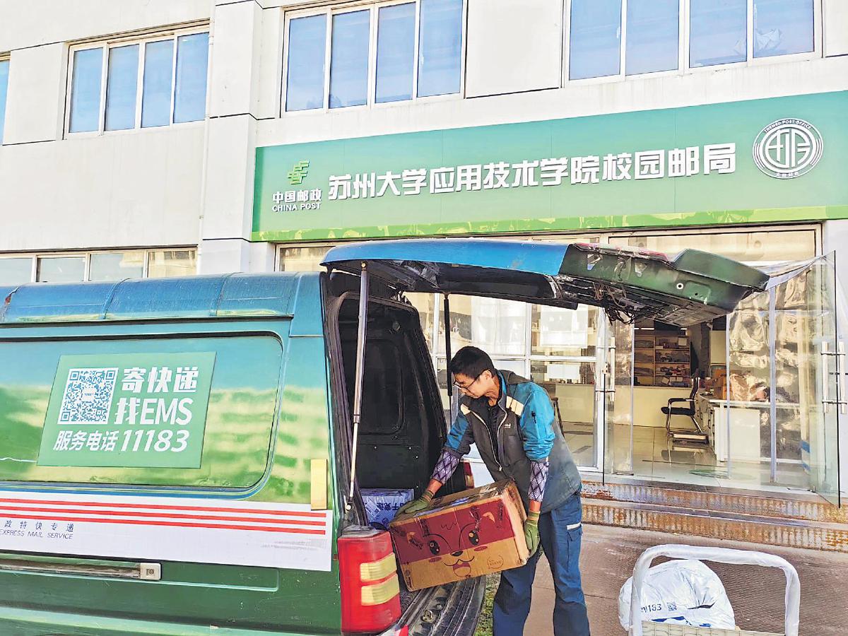 郵政工作人員將蘇州大學應用技術學院校園郵局的出口郵件搬運裝車。