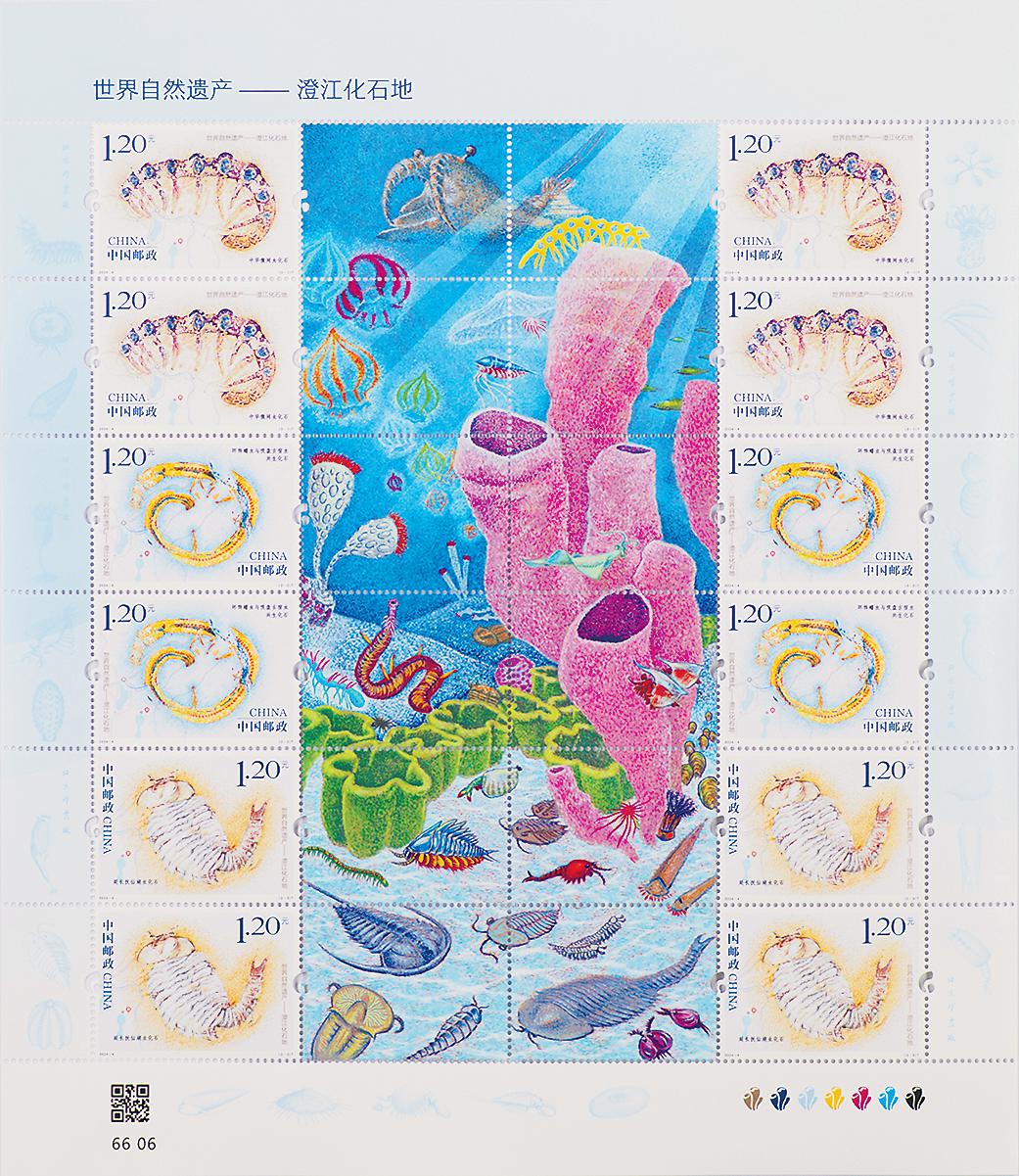 兩位設計者在本套郵票的版式設計上也有創新。郵票采用主附票的形式,主票在兩邊,附票在中間,附圖整體組成了一幅畫,完整呈現“水哥”畫的37種澄江地區特有的寒武紀早期海洋動物。大版的12枚郵票被分成3組,對應三個四方連票,每個連票里有一枚附票內容是該枚化石復原圖,且每個四方連票都會出現北京郵票廠廠標。在撕單枚做首日封的時候,也可以撕出不同組合,因此用戶購買時類似“抽盲盒”的體驗增加了集郵的趣味性。設計者還利用專家提供的資料,讓附票大版邊飾延承海洋的淺藍色調,有序排列了專家提供的主票和附票中未出現的23種其他澄江化石復原生物圖樣,大大增加了內容的豐富性,給人以視覺上的震撼。