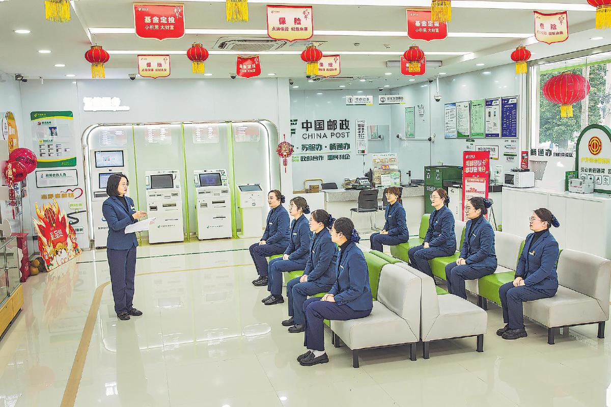 江蘇常州花園支局局長張小飛通過晨會鼓舞員工士氣、明確當(dāng)日工作任務(wù)。 □吳敏 攝