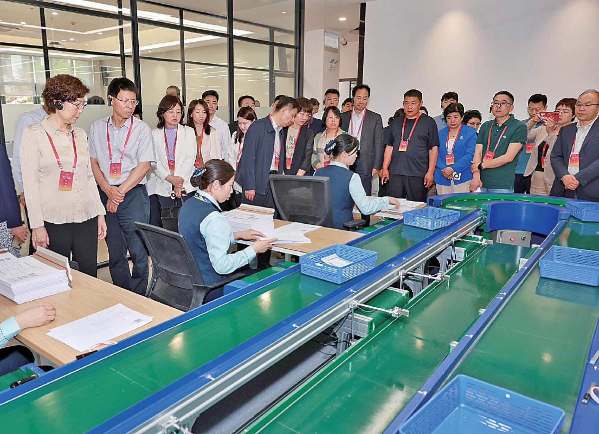 5月13日上午,來自北京、天津、河北、江蘇、山東5個省(市)的部分全國人大代表來到“江蘇法郵集約化服務(wù)中心”,先后視察法院集中送達(dá)中心、集中編目中心、12368訴訟服務(wù)熱線中心等工作區(qū)域,詳細(xì)了解了運(yùn)營模式、服務(wù)流程、創(chuàng)新成效等。