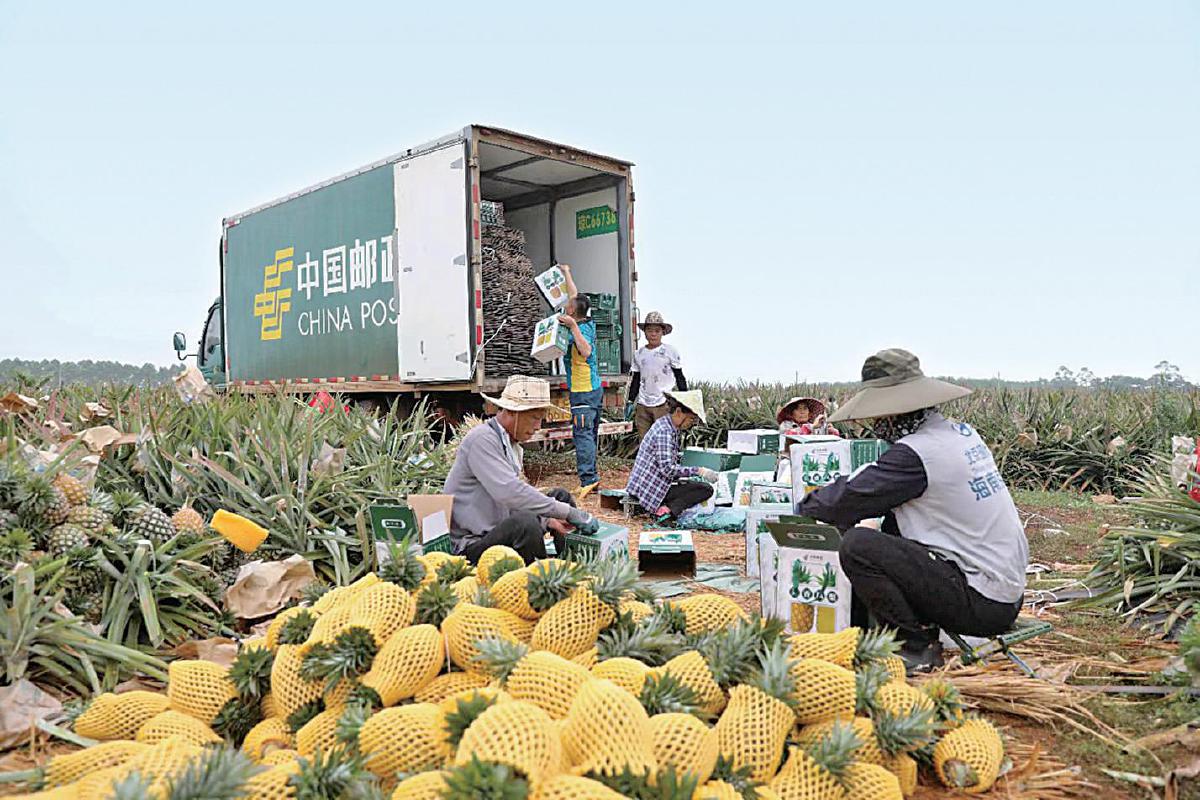 郵政工作人員在美香村種植基地現(xiàn)場(chǎng)收寄鳳梨。 □孟凡盛 攝