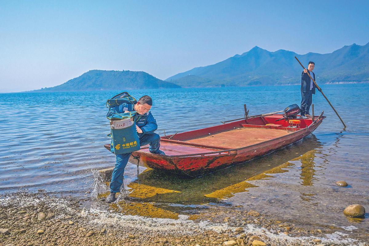 綠色摩托車、綠色郵包、絳紅色渡船、碧波蕩漾的水面和遠(yuǎn)處如黛的群山,石新國穿行其間,如同置身一幅青山綠水的秀美畫卷。“這條郵路我已經(jīng)走了20多年,只要鄉(xiāng)親們需要,我會一直走下去。”石新國堅(jiān)定地說。