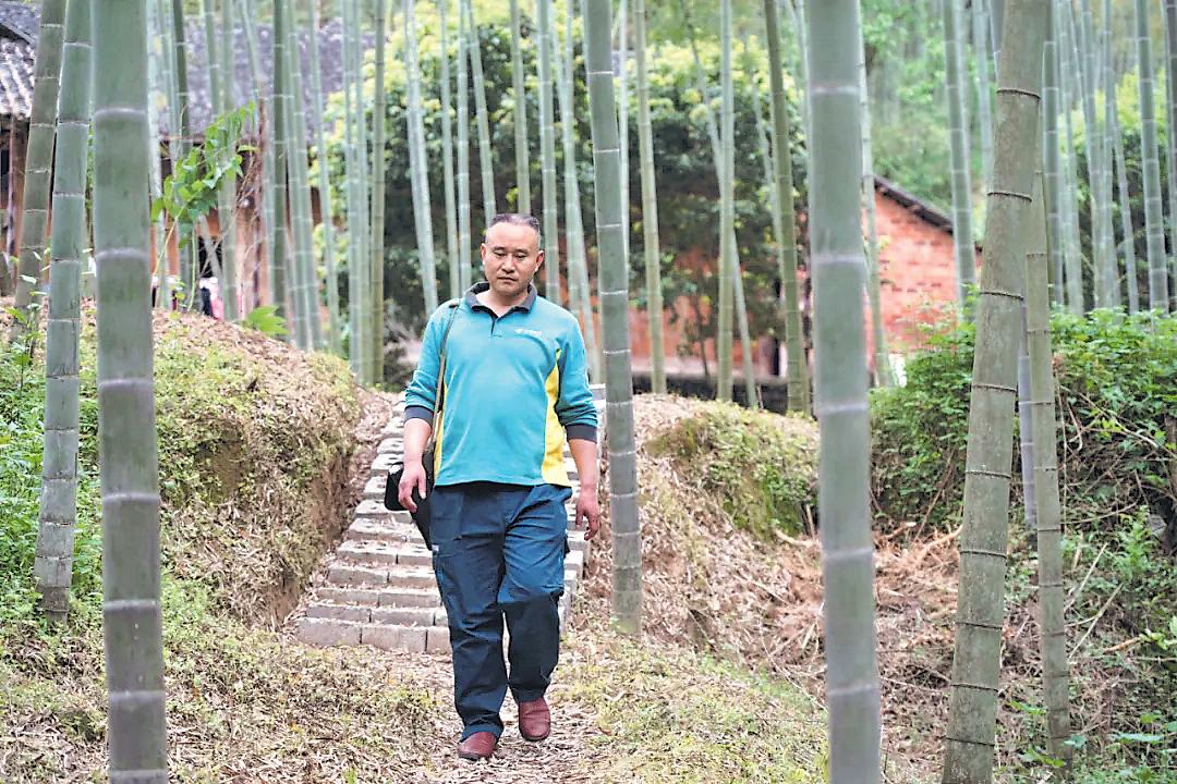 王天明背著郵包行走在鄉間小路上。