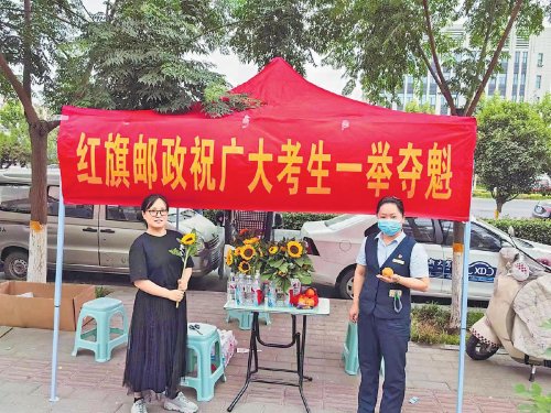 6月7日,河南省新鄉(xiāng)市紅旗區(qū)郵政分公司人民西路支局在高考考點外設(shè)置“愛心驛站”,驛站特地準(zhǔn)備了橙子和向日葵,祝愿廣大考生一舉奪魁。考試期間,該支局員工積極向家長介紹郵政金融產(chǎn)品。 □李思雨 攝影報道