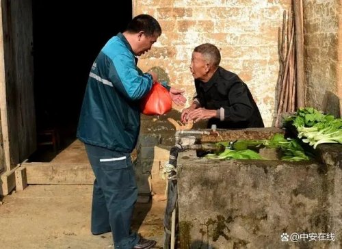 吳義陽(左)將代購的糯米送到老人手中。新華社記者 黃博涵 攝