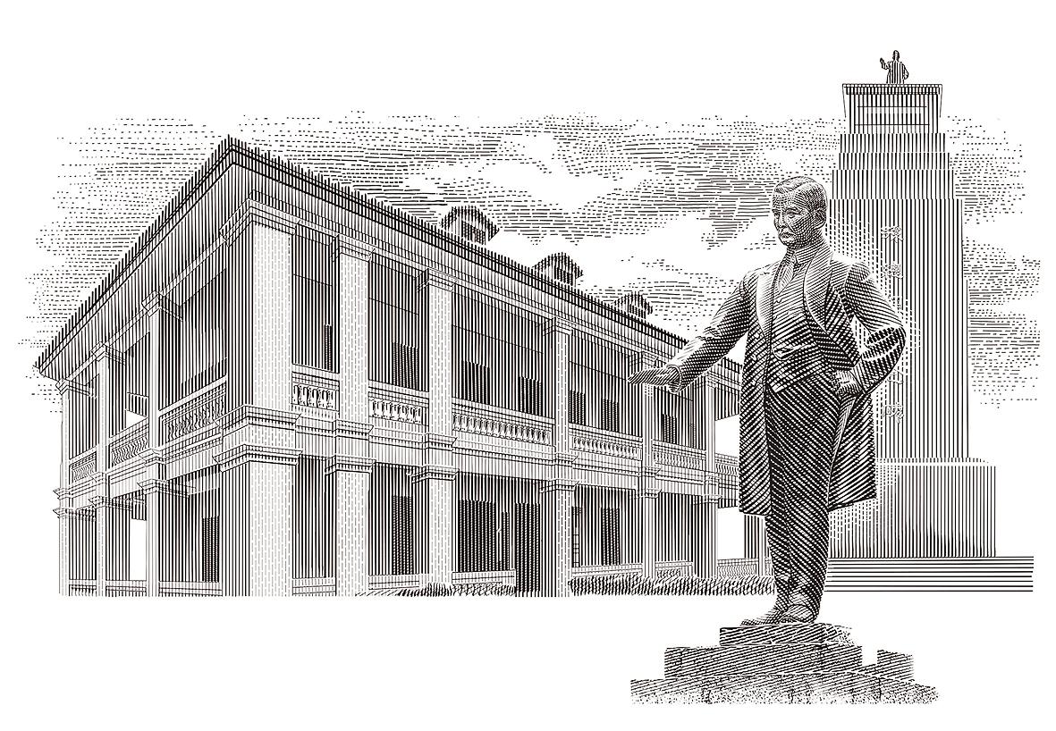 郵票二圖由徐喆和劉明慧兩位雕刻師共同創作。徐喆負責建筑部分,劉明慧負責雕像部分,于是同一枚郵票呈現出了兩種雕刻風格,建筑的粗獷和人物的細膩,二者和諧統一、相得益彰。劉明慧對人物的刻畫非常準確,能夠表現出原作的各種細微之處,特別是對人物面部表情的精準把握,呈現出雕像特有的質感和光影效果。選用紅色雕刻油墨印制,表達愛國精神,橘色的熒光使畫面更加溫暖、莊重。淡淡的米黃底色為郵票營造出一種復古的氛圍,既體現了年代感又與主題相得益彰,展現出黃埔軍校百年歷史的滄桑與厚重。