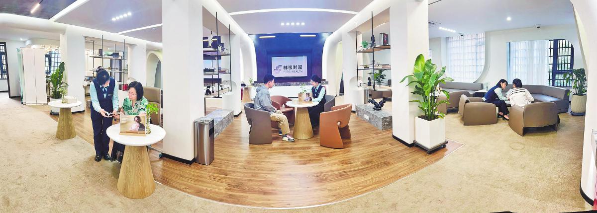 阜陽市分公司桂花苑支局財富中心員工在幽雅的環境中為客戶提供專業服務。□徐雷 攝