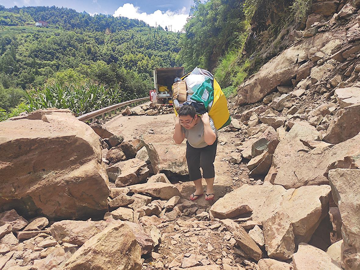 因山體滑坡、道路塌方造成郵路中斷,郵政員工接力背運傳遞郵件。□肖婉君 攝