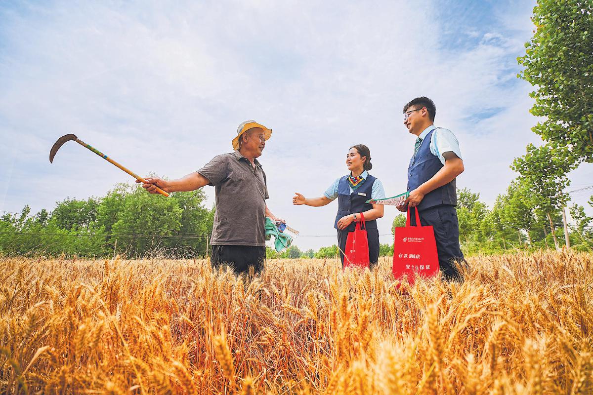 夏收時節(jié),郵政員工深入田間地頭,了解農(nóng)戶資金需求。 □李平 攝
