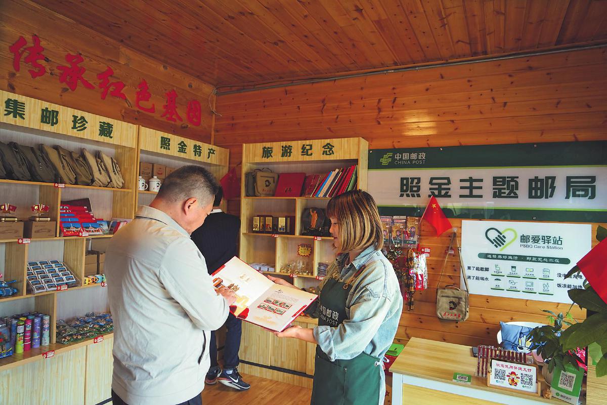 游客在紅色照金主題郵局選購郵品。