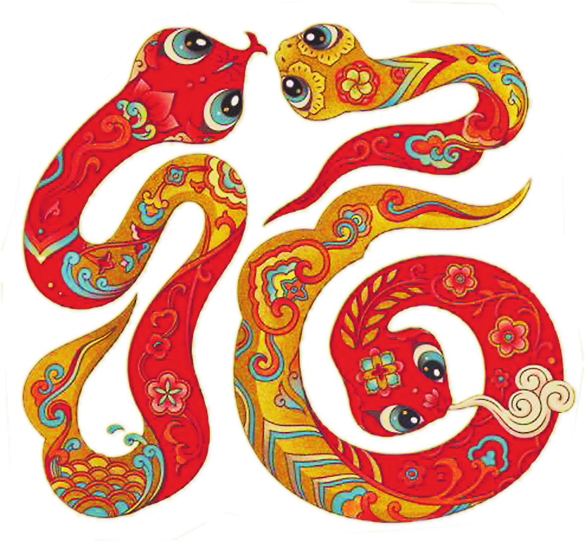 在生肖動物里,蛇的設計難度是比較大的。蛇的形象具有兩面性,它有著吉祥的象征寓意,外形卻又容易讓人產(chǎn)生畏懼感。那么,如何讓設計的蛇的形象能夠被大眾接受,是我這次創(chuàng)作面臨的主要挑戰(zhàn)。我希望塑造的蛇是對人親近的,是活潑可愛、圓潤豐滿的,所以就通過靈動的線條和姿態(tài)來表現(xiàn)其造型,在畫面上實現(xiàn)傳統(tǒng)與現(xiàn)代審美之間的平衡。
