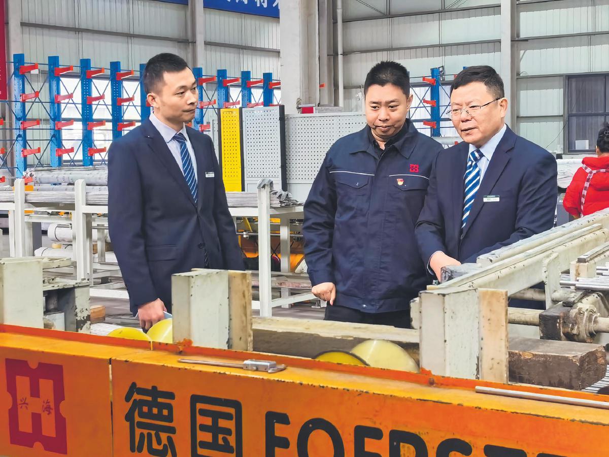 泰州市分行工作人員到江蘇興海特鋼有限公司渦流探傷檢測車間了解生產運行情況。