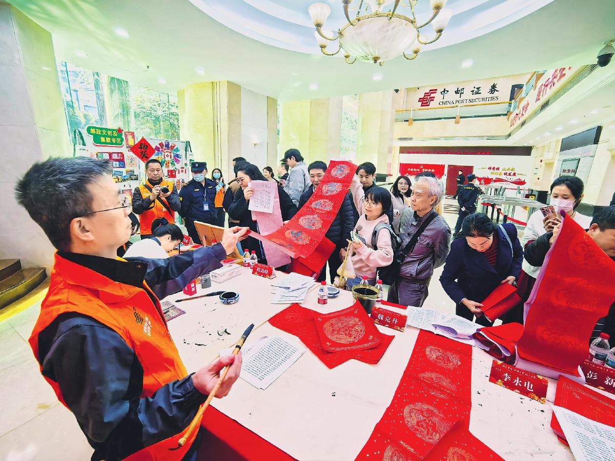 祥龍擺尾送舊歲,靈蛇獻瑞啟新春。臨近春節,廣東省深圳市郵政分公司工會牽頭開展了“蛇來運轉 郵行千里 福送萬家”義寫春聯活動。在寶通大廈、福田濱海營業所、郵政大廈“職工之家”,特邀的書法家們在一張張喜慶的紅紙上揮毫潑墨,一副副春聯、一個個“福”字躍然紙上,將飽含著的濃濃喜氣和美好的祝福傳遞給了基層員工和附近的社區居民。
