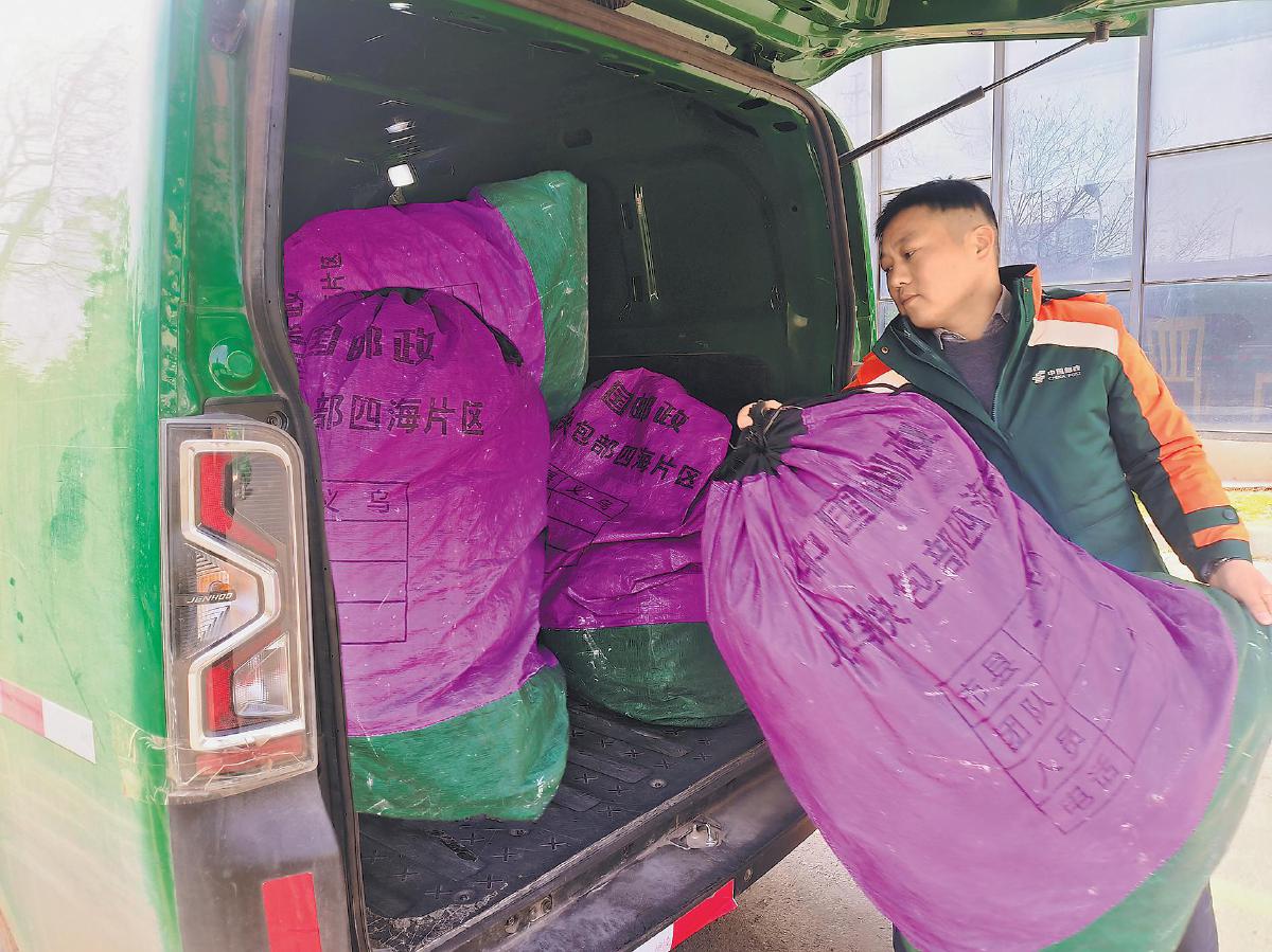 陳地久攬收郵件后裝車。 □厲楠 攝
