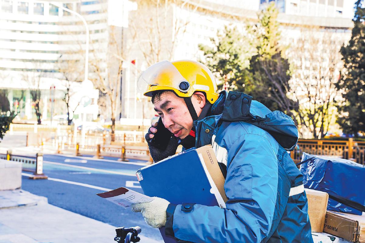 近幾日,受寒潮影響,西北、華北等地出現大風天氣,降溫明顯。郵政投遞員克服天氣影響,按時出班,將一件件傳遞“溫暖”的包裹及時、準確送達客戶手中。圖為2月7日上午,北京市東城區建內大街郵政支局投遞員張業田冒著寒風穿行在胡同與大廈之間,按時送出100多件包裹和300多份報紙。