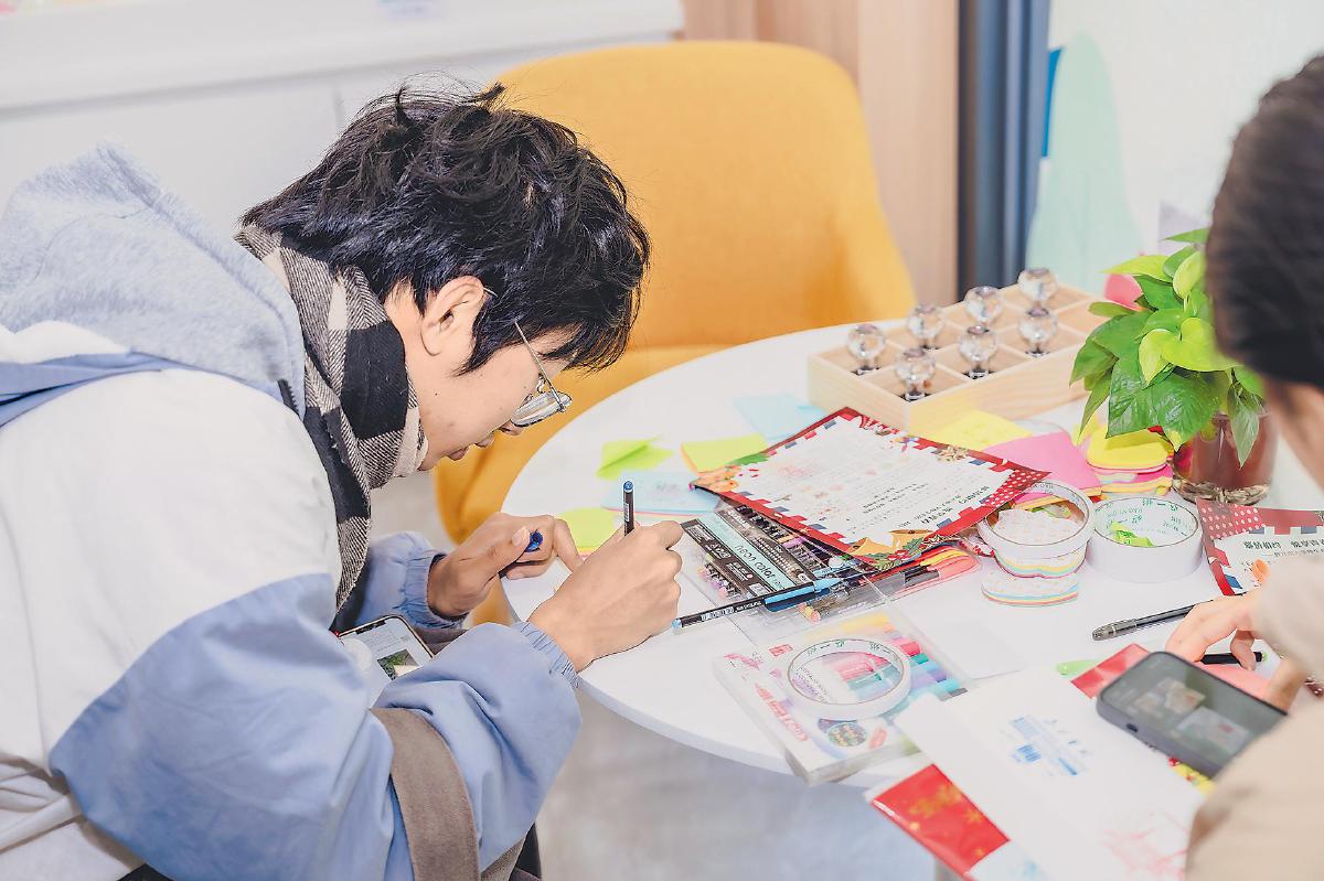 江南大學(xué)的學(xué)生在校園郵局加蓋特色郵戳、書寫明信片,享受“郵文化”樂趣。