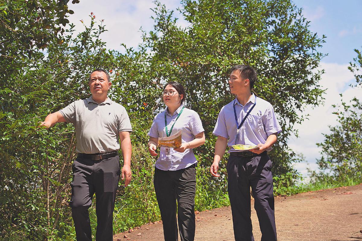 梅州市分行信貸員跟隨客戶(hù)查看農(nóng)作物生長(zhǎng)情況。