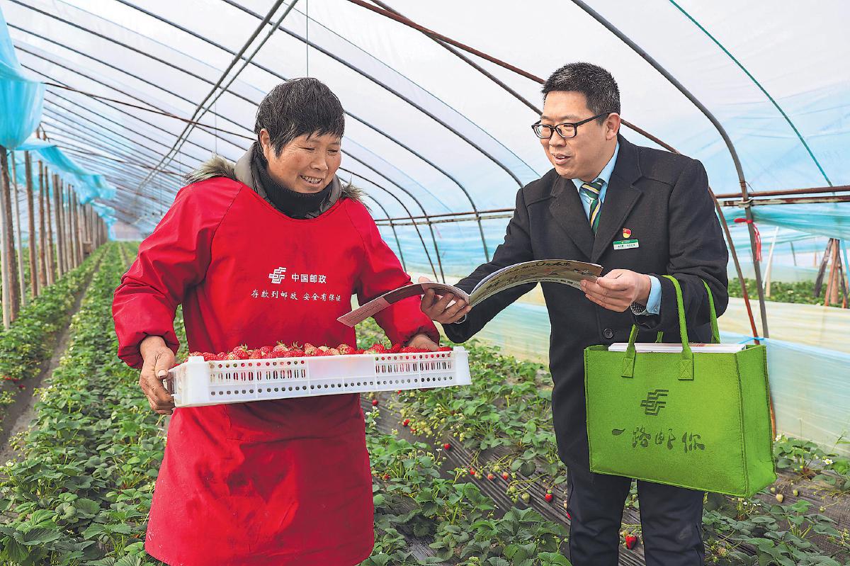 眼下正是草莓上市的關(guān)鍵時期,湖北省襄陽市郵政分公司主動做好“三農(nóng)”服務(wù),聚焦草莓產(chǎn)業(yè)鏈發(fā)展,聯(lián)合當?shù)剜]儲銀行提供惠農(nóng)貸款、銷售、寄遞等一條龍服務(wù),并于日前啟動草莓同城配送項目,規(guī)劃生鮮寄遞專門運輸線路,助力特色農(nóng)業(yè)產(chǎn)業(yè)發(fā)展壯大。圖為3月5日,襄陽郵政工作人員走進大棚,向種植戶宣講郵政服務(wù)舉措。