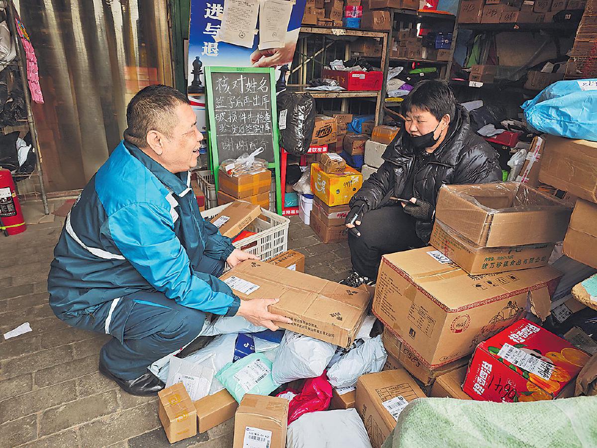全國人大代表、河北省邢臺市郵政分公司城區(qū)寄遞事業(yè)部鄉(xiāng)郵員郭紅崗向投遞道段上的客戶講述全國兩會的盛況,傳遞黨的聲音。 □程鈺 孫延兵 攝