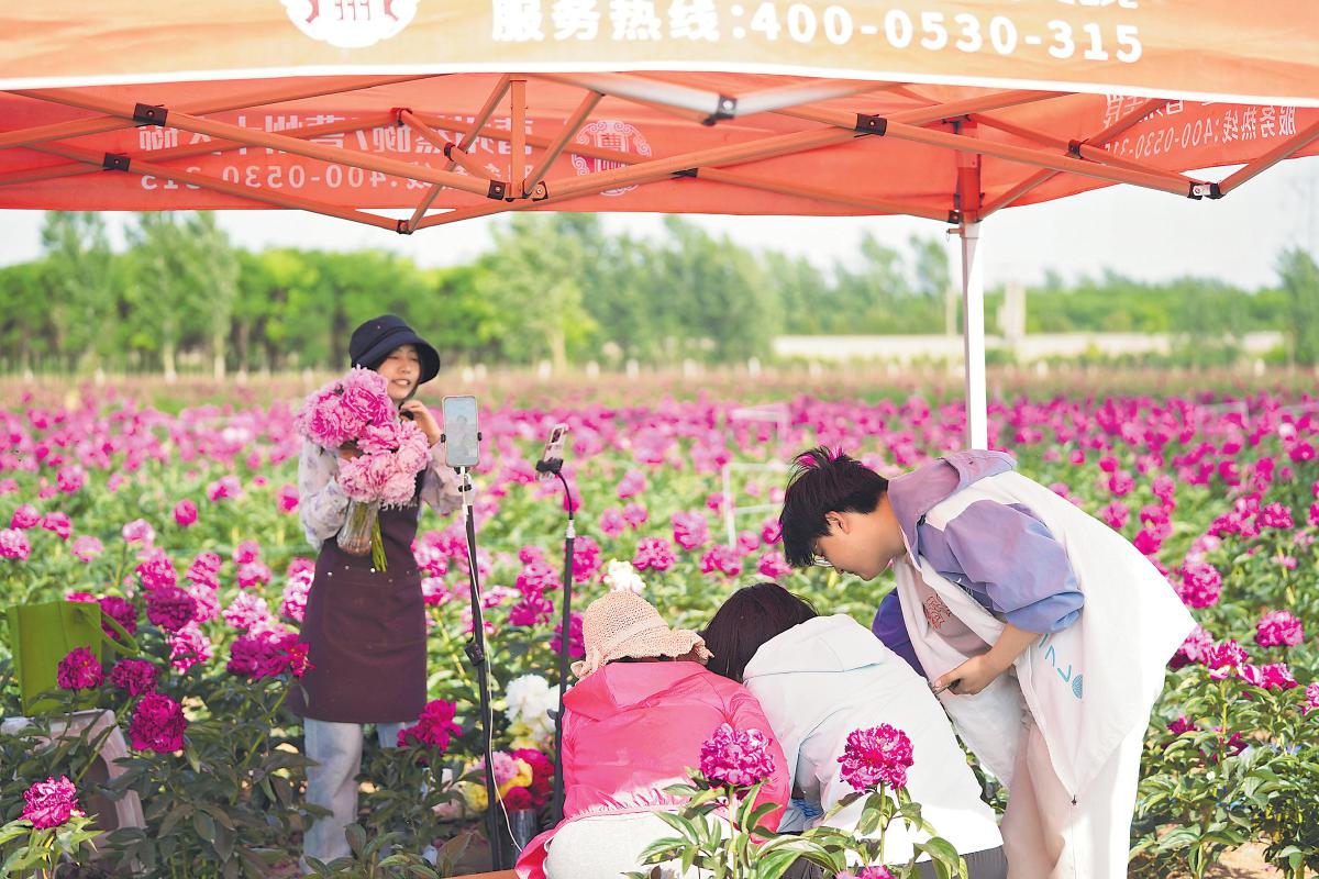 菏澤郵政直播團隊走進種植基地,開展芍藥鮮切花直播。 □趙現萌 攝