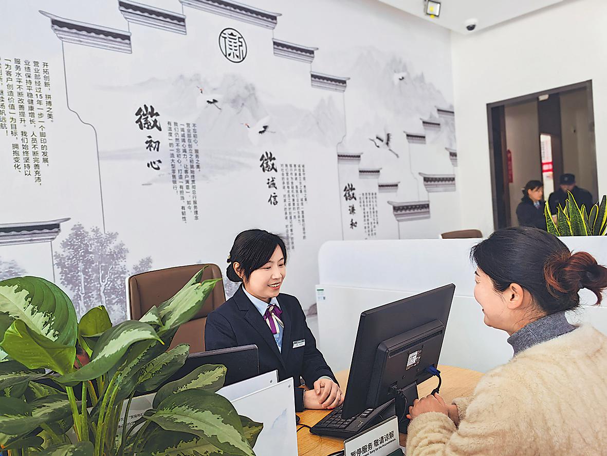 走進網點,滿目皆景。磚石土木搭建起金融服務的框架,徽派元素的點綴賦予其獨特的魅力與韻味。以徽州建筑為設計靈感的文化幕墻,讓每一位到訪者都身臨其境地體會到“一蓑煙雨夢徽州,青磚黛瓦馬頭墻”的美景。“營業部成立于2008年。2023年,我們結合‘徽文化’特色對網點進行了全面裝修改造。”黃山市分行營業部負責人朱震星介紹,在“徽文化”的熏陶下,黃山市分行營業部充分融入了徽派建筑的風格、徽商文化的精神。