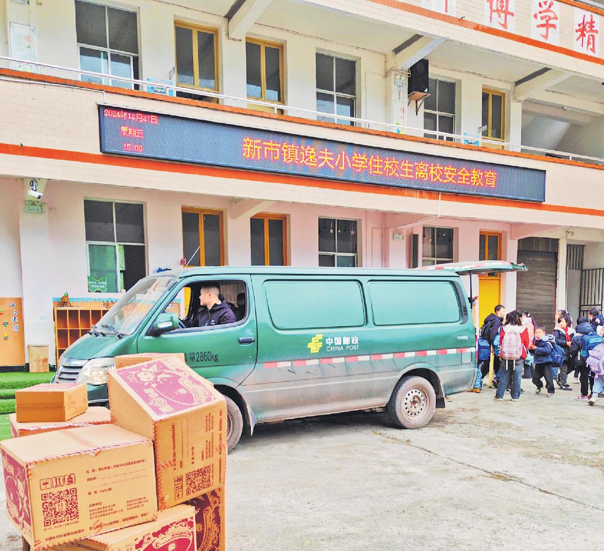 2024年末,郵車為宜賓市屏山縣新市鎮逸夫小學學生送去愛心包裹?!?/p>