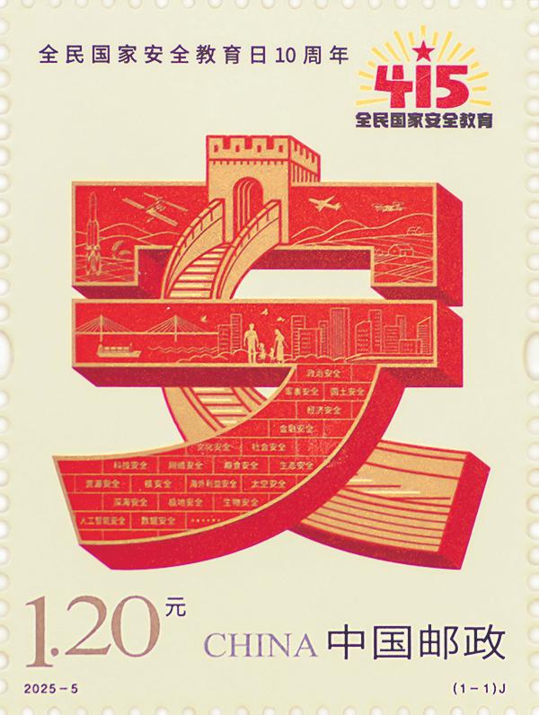 該郵票圖案采用醒目、莊重的紅金配色為主色調(diào),以漢字“安”與安居樂業(yè)的人民、意象化的長城、城鄉(xiāng)建筑、麥穗、火箭、飛機、高鐵等元素進行同構(gòu)設(shè)計,構(gòu)成一幅社會穩(wěn)定繁榮的美好畫面,同時融入全民國家安全教育標(biāo)識圖案,體現(xiàn)出大安全理念和國家安全教育主題。國家安全目前所涉及的多個重點領(lǐng)域采用一塊塊磚石壘砌,寓意總體國家安全觀內(nèi)涵豐富,象征著新時代國家安全堅如磐石。郵票印制細節(jié)清晰自然,圖中金字采用鏤空套印,既確保金字的飽滿明亮,也大幅提升批量印刷的穩(wěn)定性。紫外燈下,紅墨呈現(xiàn)鮮艷紅熒光效果,層次分明,增強了郵票的防偽性與觀賞性。