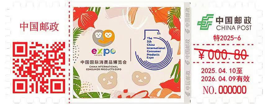 “第五屆中國(guó)國(guó)際消費(fèi)品博覽會(huì)數(shù)字化彩色郵資機(jī)宣傳戳”采用目前最新款TS71郵資機(jī)制作,每一枚戳的規(guī)格為72mm×28.5mm,面值為0.8元,使用期限為2025年4月10日至2026年4月9日,全國(guó)共發(fā)行12.1萬枚。票面設(shè)計(jì)分為左中右三塊區(qū)域,左側(cè)印有“中國(guó)郵政”字樣;中間區(qū)域?yàn)橹鲌D部分,展現(xiàn)的是消博會(huì)的吉祥物“元元”和“宵宵”擁抱的形象,吉祥物的原型是海南獨(dú)有、世界珍貴的靈長(zhǎng)類動(dòng)物長(zhǎng)臂猿,同時(shí)巧妙地融合了海南熱帶雨林的自然風(fēng)光以及消博會(huì)5周年的標(biāo)識(shí),既展現(xiàn)消博會(huì)的精品路線定位,又蘊(yùn)含了海南特色風(fēng)貌;右側(cè)的上方印有“中國(guó)郵政”字樣及標(biāo)識(shí),下方則是資費(fèi)及使用期限;中間主圖及右側(cè)之間印有郵政特殊金屬防偽線。