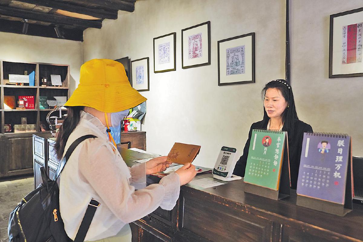 在郵政歷史陳列區,一件件老物件呈現了中國郵政的發展脈絡。文創區木制展架上,“三國英雄”主題明信片、古鎮風景冰箱貼等各類文創產品琳瑯滿目。為將郵政服務與茶文化深度融合,羊樓洞郵局開發了《萬里尋茶道 赤壁借東風》明信片,游客掃碼可觀看赤壁青磚茶文化和三國歷史故事;特制的郵票茶磚將《三國演義》系列郵票融入赤壁青磚茶制作工藝,透出濃濃的歷史韻味,吸引游客駐足觀賞、挑選購買。