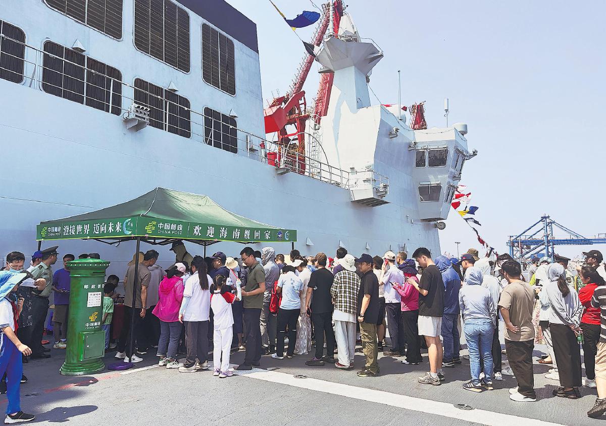 在人民海軍成立76周年之際,入列4年的海南艦回到“家鄉(xiāng)”,于海南省澄邁縣馬村散貨碼頭穩(wěn)穩(wěn)靠港。4月24日至26日,海南艦面向公眾開放。澄邁縣郵政分公司抓住機(jī)遇,積極開展雙擁共建工作,主動(dòng)參與艦艇開放日活動(dòng),宣傳海軍建設(shè)成就。