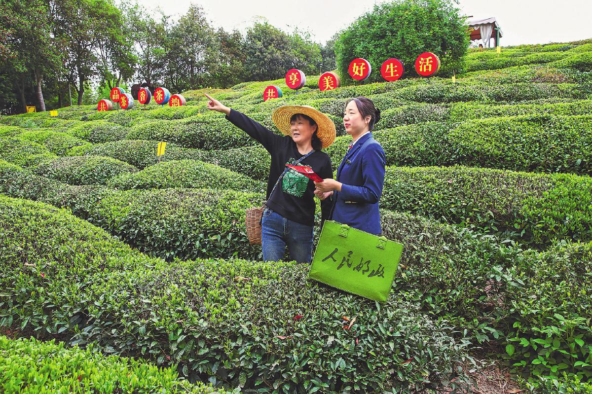 郵政員工與茶農(nóng)交流,共話春茶好收成。□徐雷 攝